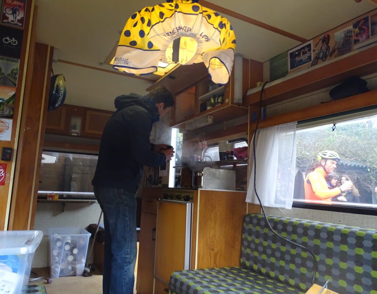 En geen laf bakkie, maar uitstekende koffie gezet door Henk Potman met zijn leuke Vespa Ape koffiebar.